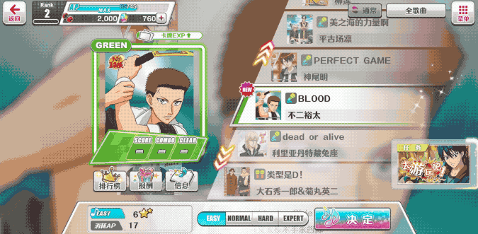 作为一款音游 ,使玩家在视觉听觉上获得极大满足感,玩家首先接触的当然是音乐 ,不同的音乐拥有不一样的操作以及难度,再用音乐推动玩家情感,这个玩法确实与我想象的有所出入 ,而第一首音乐刚好是《网球王子》的片头曲《Future》,游戏以“下落式音游”玩法为操作核心,充满着热爱与期待,